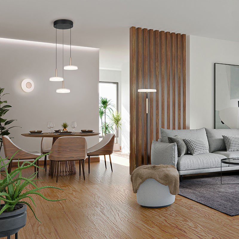 Idéale au-dessus d'une table basse de salon (comme illustré), d'un coin lecture ou pour éclairer un îlot de cuisine étroit, elle apportera une verticalité et un rythme visuel très apprécié par les architectes d'intérieur.