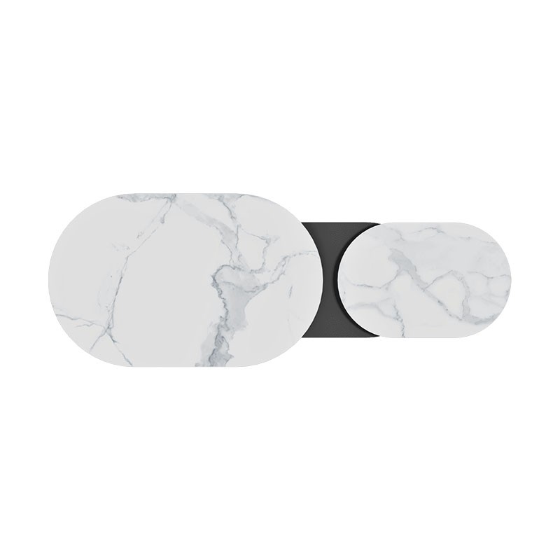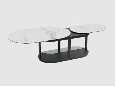 La particularité réside dans ses deux plateaux supérieurs de forme ovale qui sont pivotants, permettant de les écarter pour révéler un espace de rangement intermédiaire et d'agrandir la surface utilisable.