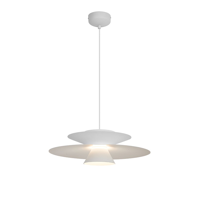 La structure en disques étagés guide la lumière vers le bas tout en laissant filtrer un halo délicat vers le haut.