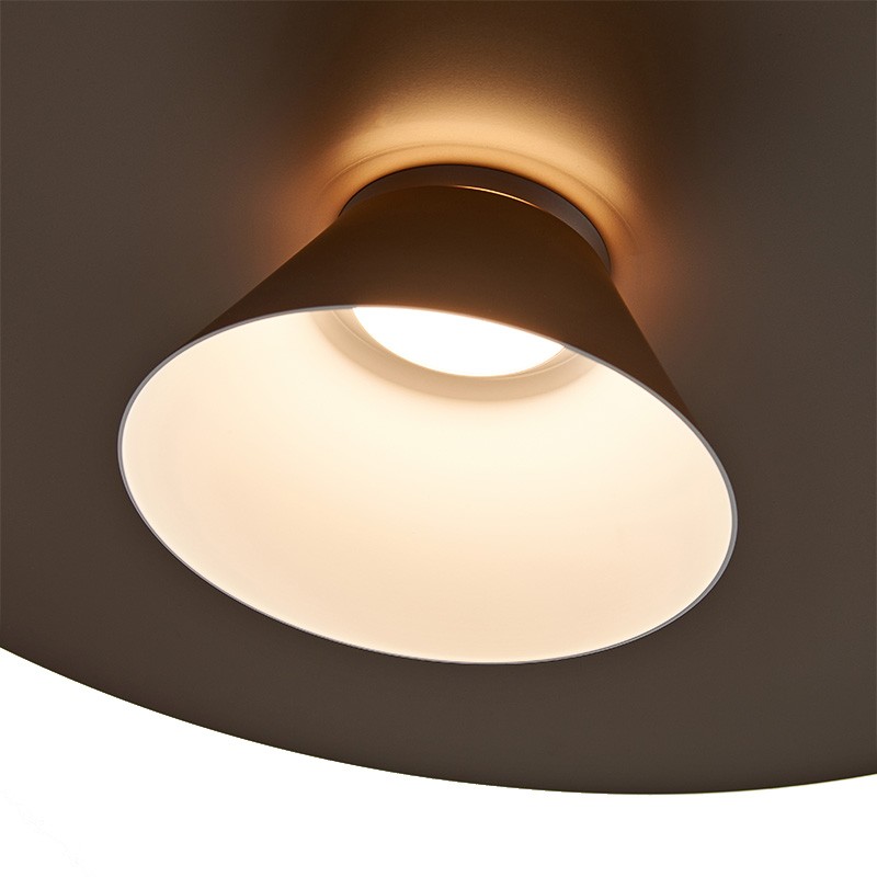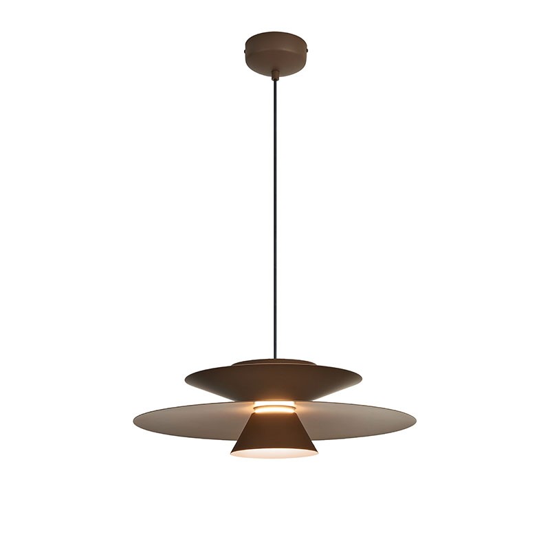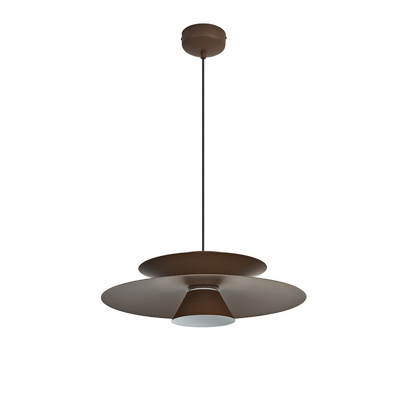 La structure en disques étagés guide la lumière vers le bas tout en laissant filtrer un halo délicat vers le haut.