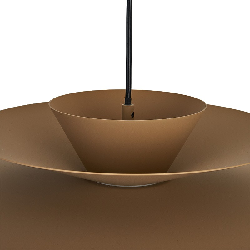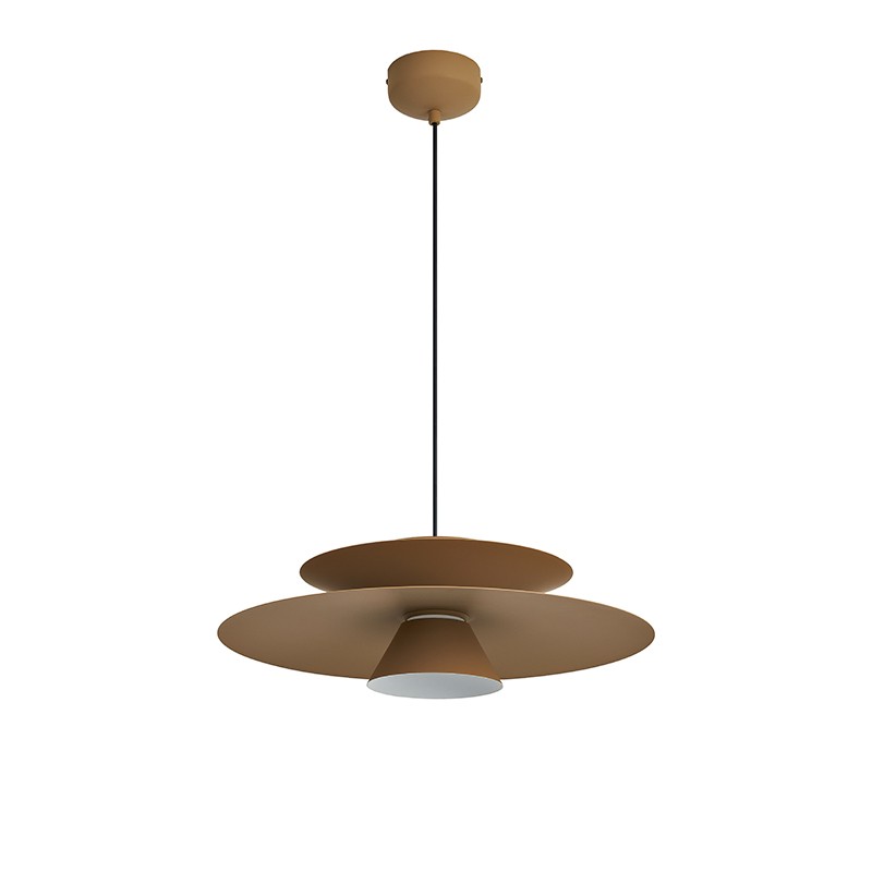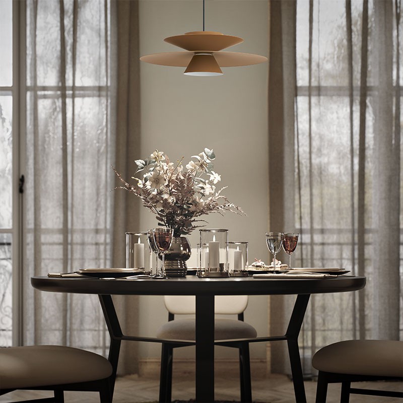 La structure en disques étagés guide la lumière vers le bas tout en laissant filtrer un halo délicat vers le haut.