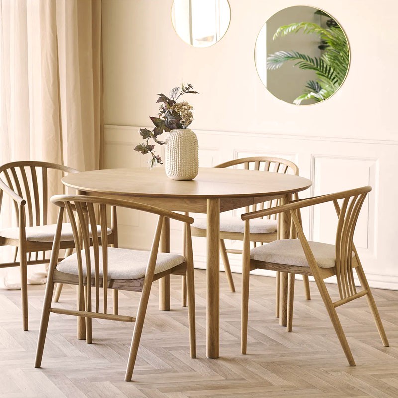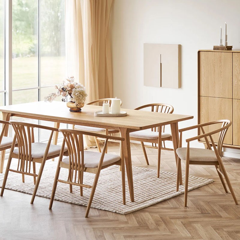 Conçue en chêne massif, elle garantira une robustesse remarquable tout en affichant une silhouette aérienne et raffinée inspirée du style "Windsor" moderne, avec une structure fluide reliant les pieds aux accoudoirs.