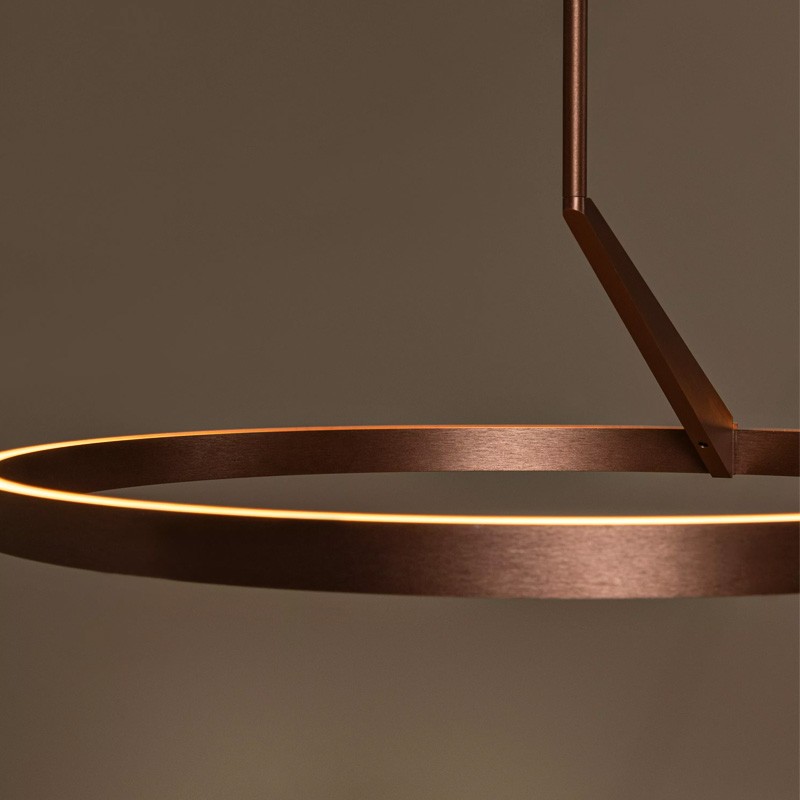 Le luminaire Applause redéfinit l'éclairage contemporain avec sa silhouette minimaliste en forme d'anneau et sa finition "Café" brossée ultra-chaleureuse.