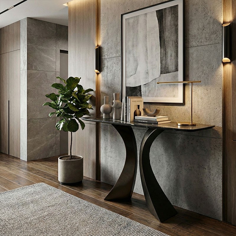Conseil déco : placez un grand miroir circulaire au-dessus ou un vide-poche en laiton pour souligner le contraste entre le marbre noir et les reflets métalliques.