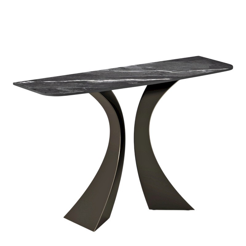 Les deux pieds centraux en métal, aux courbes incurvées et divergentes, créent une silhouette dynamique qui semble défier la gravité.