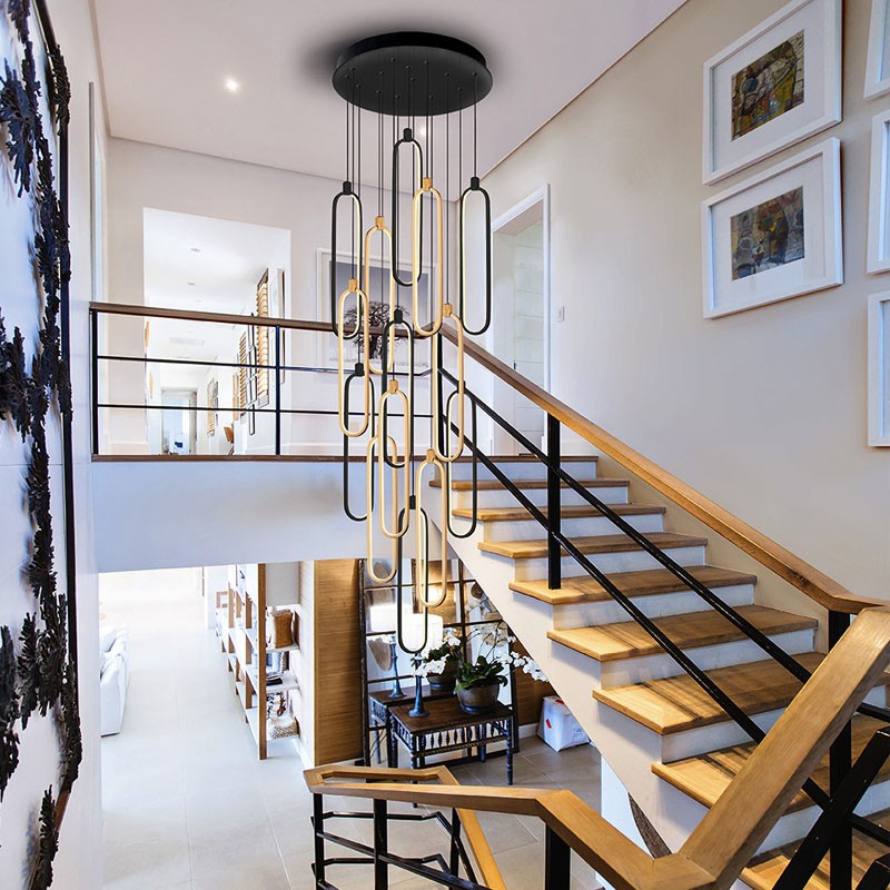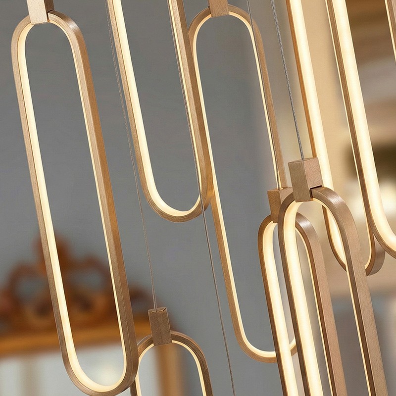 Composé de 14 anneaux oblongs suspendus, ce lustre crée un effet de cascade verticale unique.